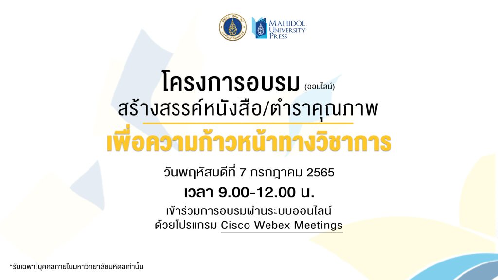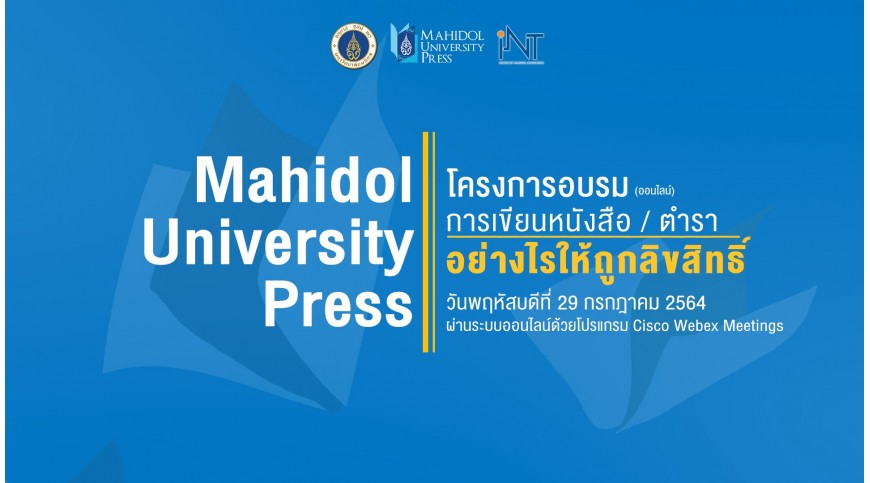 โครงการอบรม ” การเขียนหนังสือ/ตำรา อย่างไรให้ถูกลิขสิทธิ์ “ วันที่ 29 กรกฎาคม 2564 สำนักพิมพ์มหาวิทยาลัยมหิดลร่วมกับสถาบันบริหารจัดการเทคโนโลยีและนวัตกรรม มหาวิทยาลัยมหิดล (iNT) จัดอบรม “โครงการเขียนหนังสือ/ตำรา อย่างไรให้ถูกลิขสิทธิ์” ผ่านระบบออนไลน์ (WebEx) โดยมีวัตถุประสงค์เพื่อให้มีความเข้าใจในกฎเกณฑ์และวิธีการดำเนินงานเพื่อให้ได้มาซึ่งผลงานอันทรงคุณค่าและมีความถูกต้องด้านลิขสิทธิ์ การอบรมในครั้งนี้ ศาสตราจารย์