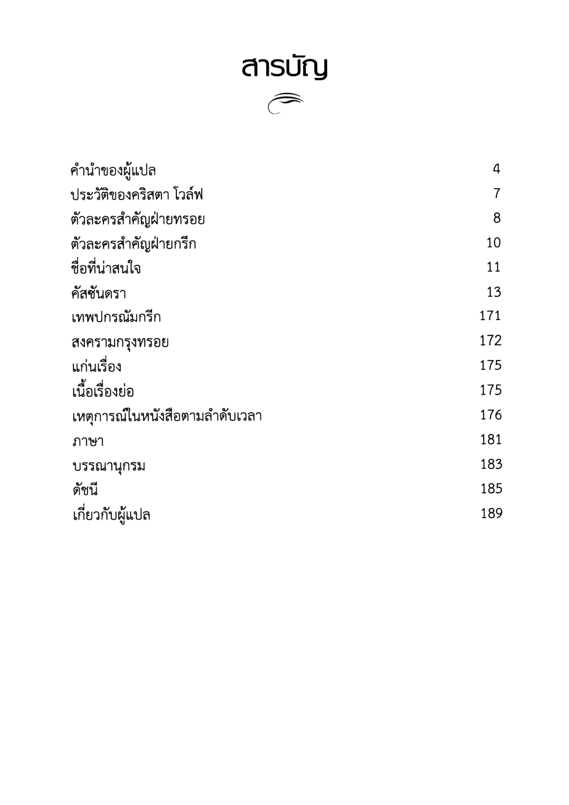 แปลจากต้นฉบับภาษาเยอรมัน ผู้ประพันธ์คือ คริสตา โวลฟ์ ใช้สงครามกรุงทรอยเป็นโครงหลักของเรื่อง โดยปรับแต่งรายละเอียดเพื่อสะท้อนแนวคิดเกี่ยวกับการปกครองที่ชายเป็นใหญ่ว่า สามารถนำมาซึ่งหายนะได้อย่างไร