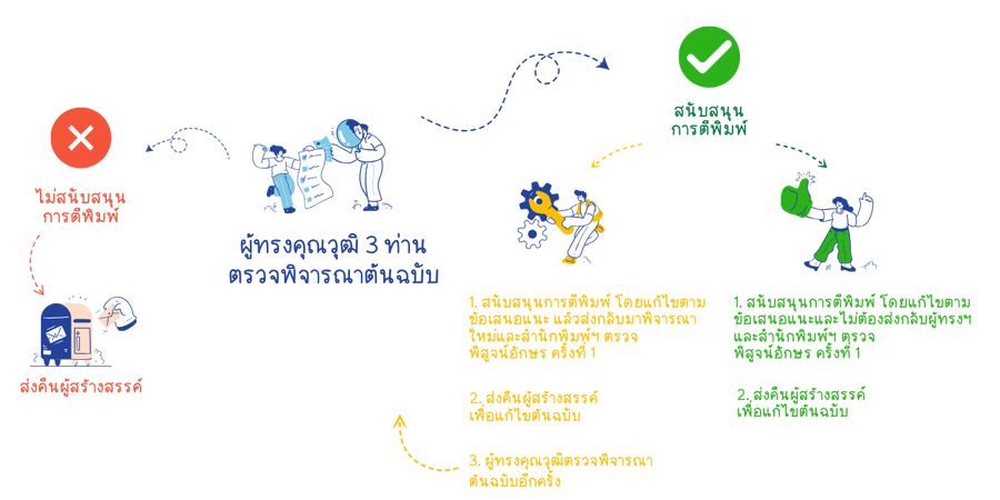 หากผ่านการพิจารณาและสำนักพิมพ์ฯ แต่งตั้งผู้ทรงคุณวุฒิเรียบร้อยแล้ว ขั้นตอนถัดไปเป็นการพิจารณาของผู้ทรงคุณวุฒิ ดังนี้
