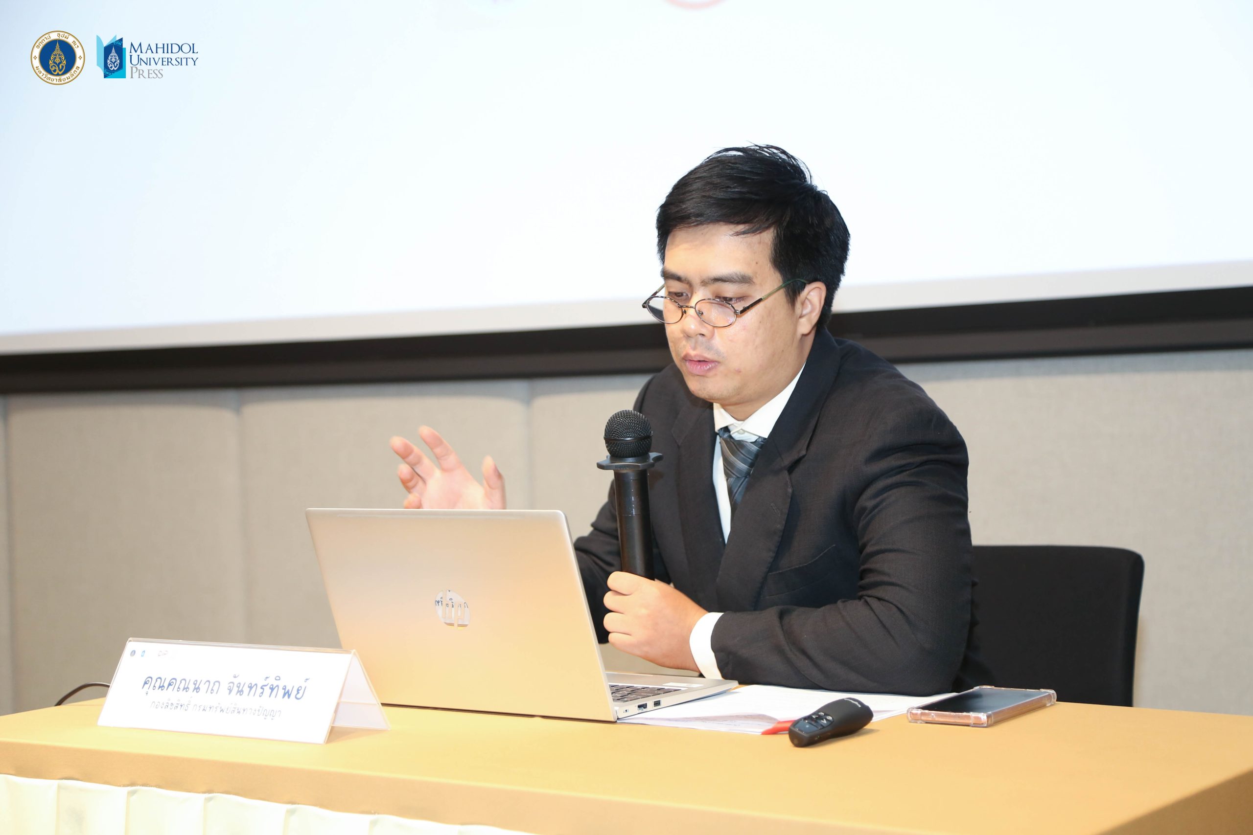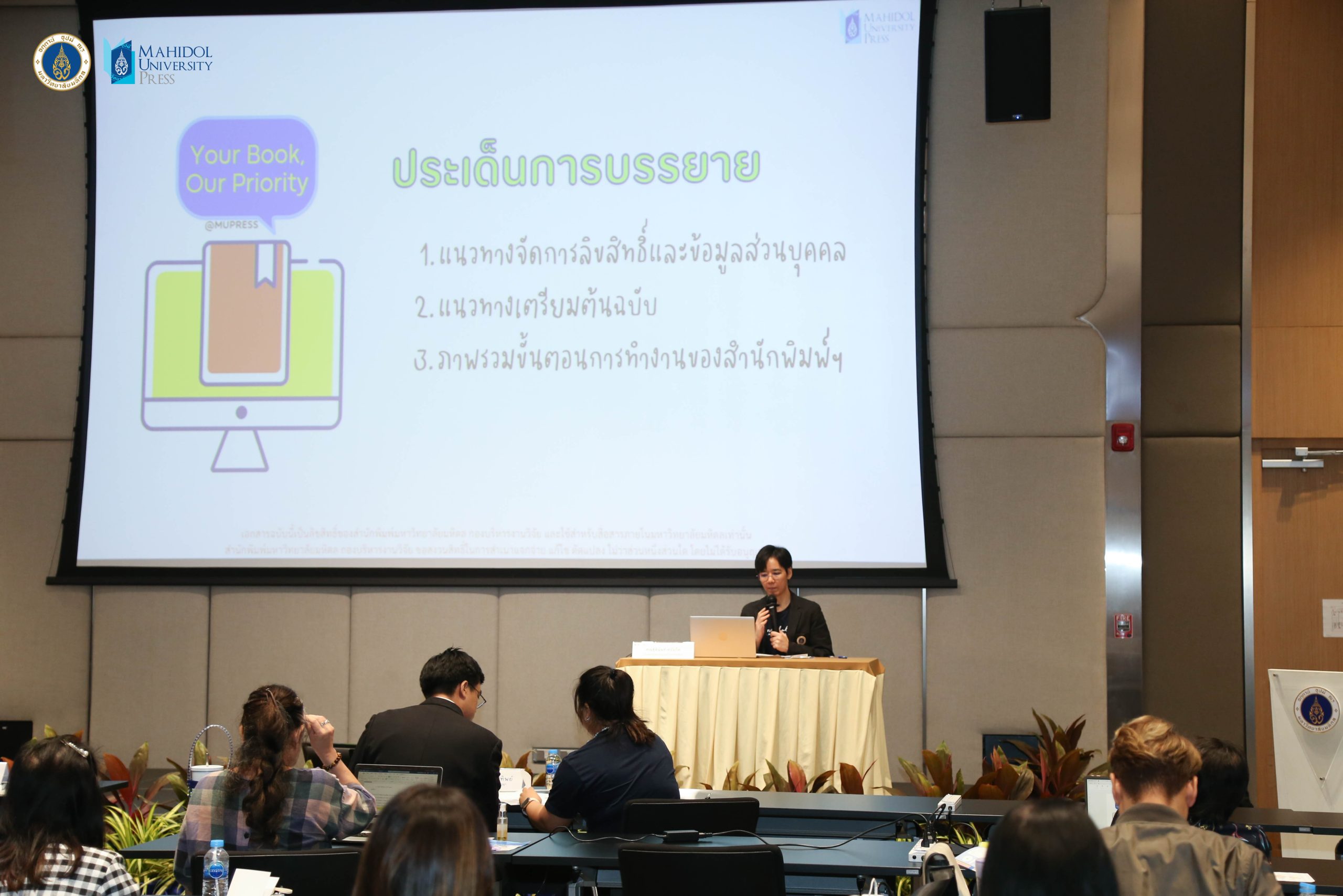 จากนั้นจึงเริ่มการบรรยายช่วงที่ 1 ในหัวข้อ “ลิขสิทธิ์ควรรู้สำหรับผู้สร้างสรรค์หนังสือ/ตำรา” โดย คุณคณนาถ จันทร์ทิพย์ จากกองลิขสิทธิ์ กรมทรัพย์สินทางปัญญาและการบรรยายช่วงที่ 2 ในหัวข้อ “แนวทางจัดการลิขสิทธิ์และเตรียมต้นฉบับเพื่อตีพิมพ์กับ MU PRESS” โดย คุณฐิตินันท์ ศรีสถิต เจ้าหน้าที่สำนักพิมพ์มหาวิทยาลัยมหิดล
