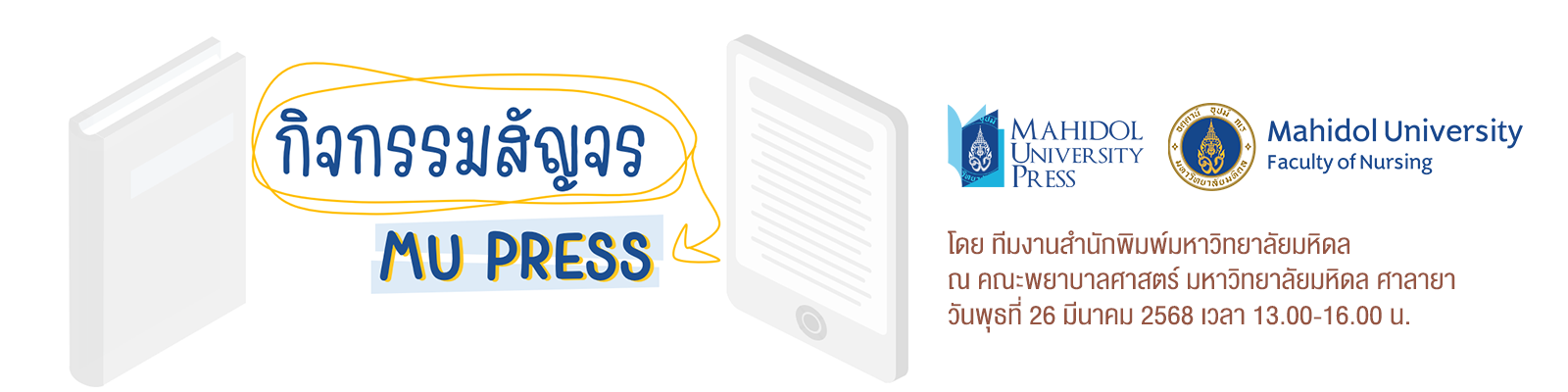คณะพยาบาลศาสตร์ มหาวิทยาลัยมหิดล เชิญสำนักพิมพ์มหาวิทยาลัยมหิดลจัดกิจกรรมสัญจร (Roadshow) บรรยาย หัวข้อ “Ep.2 กับดักและหลุมพรางในการทำตำรา และหนังสือวิชาการ” ในวันที่ 26 มีนาคม 2568 เวลา 13.00-16.00 น.