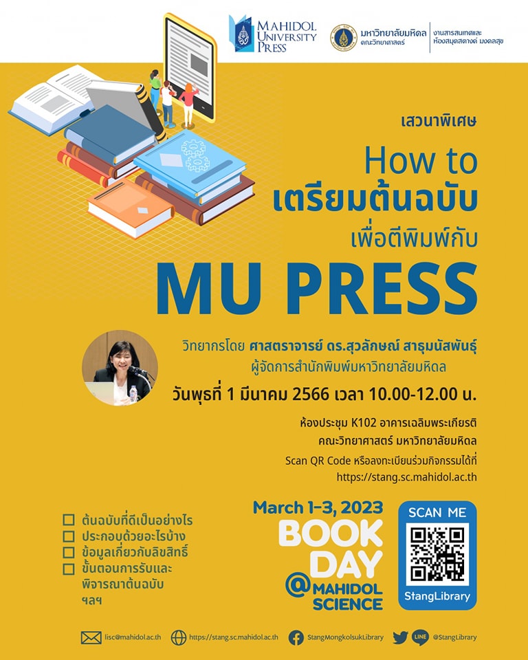 สำนักพิมพ์ฯ จัดการบรรยาย พิเศษหัวข้อ “How to เตรียมต้นฉบับ เพื่อตีพิมพ์กับ MU PRESS” โดย ศาสตราจารย์ ดร.สุวลักษณ์ สาธุมนัสพันธุ์ ผู้จัดการสำนักพิมพ์ฯ ณ ห้องประชุม K102 อาคารเฉลิมพระเกียรติ เวลา 10.00-12.00 น. เนื้อหาการบรรยายประกอบด้วยแนวทางการเตรียมต้นฉบับ การจัดการด้านลิขสิทธิ์ที่เกี่ยวข้องกับการเขียนหนังสือ/ตำรา และขั้นตอนการทำงานของสำนักพิมพ์ฯ เพื่อให้ข้อมูลและสร้างความเข้าใจที่ถูกต้องแก่อาจารย์และบุคลากรมหาวิทยาลัยมหิดล