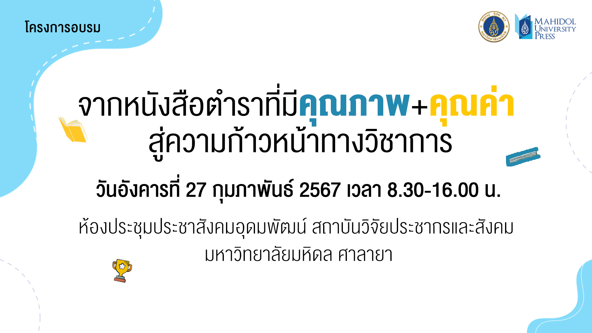 เมื่อวันอังคารที่ 27 กุมภาพันธ์ 2567 เวลา 9.00-16.00 น. สำนักพิมพ์มหาวิทยาลัยมหิดล จัดโครงการอบรม หัวข้อ “จากหนังสือตำราที่มีคุณภาพ+คุณค่า สู่ความก้าวหน้าทางวิชาการ” ณ ห้องประชุมประชาสังคมอุดมพัฒน์ สถาบันวิจัยประชากรและสังคม มหาวิทยาลัยมหิดล ศาลายา